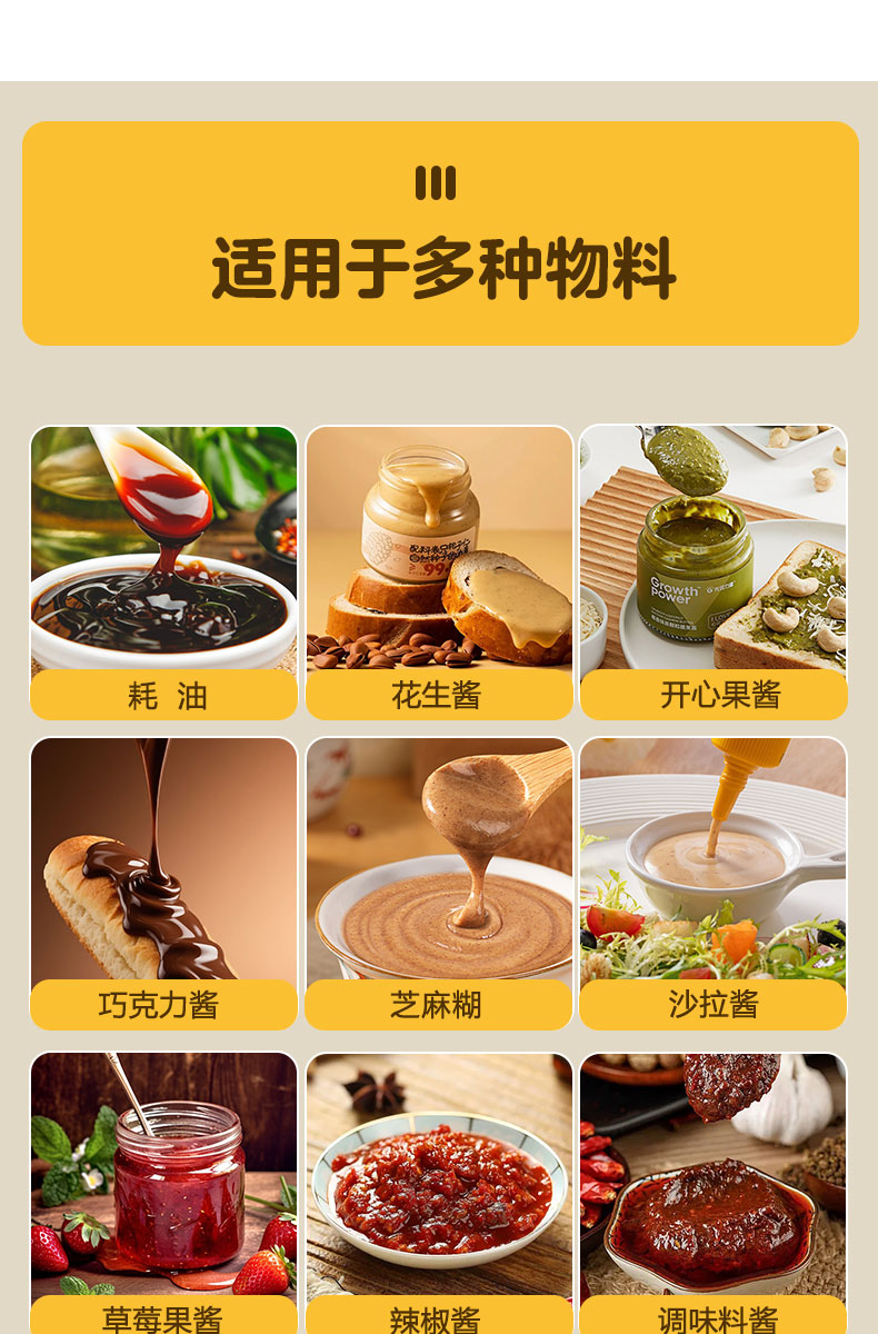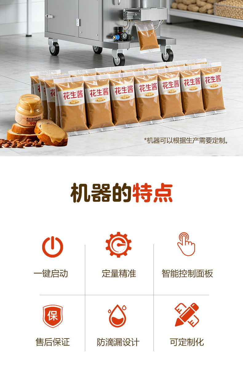 捷鼎生產(chǎn)的200ML氣動膏體包裝機適用于花生醬、番茄醬、辣椒油、火鍋底料、芝麻醬、咖哩醬、黑胡椒醬、辣椒醬、蜂蜜、枇杷膏、沙拉醬、水果醬、藥膏等液體,膏體,醬料、混合料等產(chǎn)品的定量、稱重、灌裝、包裝、封口。